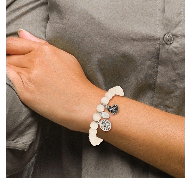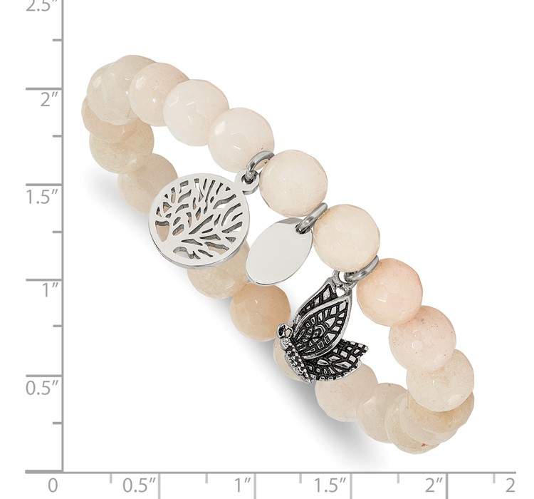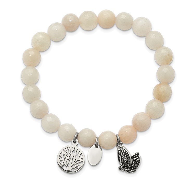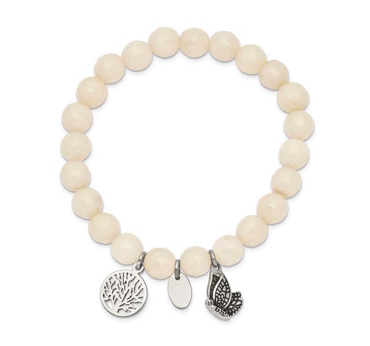 Chisel Stainless Steel Antiqued and Polished Butterfly and Tree of Life 8mm White Jade Beaded Stretch Bracelet