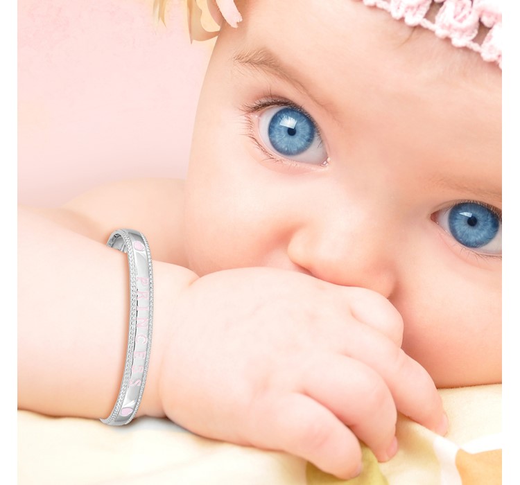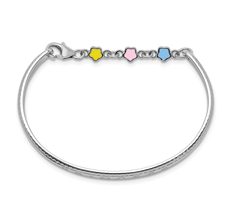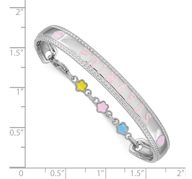 Sterling Silver Rhodium-plated Polished and Beaded Multi-color Enameled Flowers and Hearts PRINCESS with Chain Baby Bangle