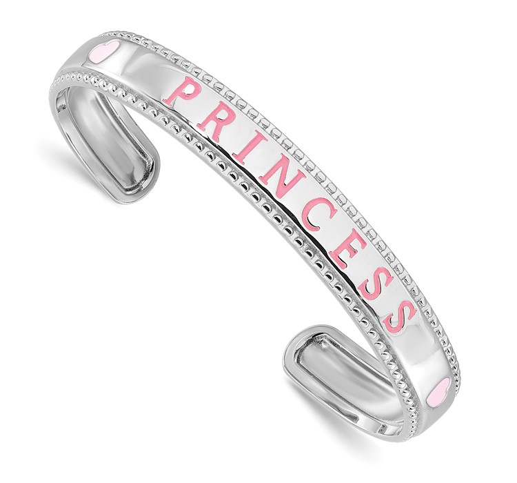 Sterling Silver Rhodium-plated Polished and Beaded Pink Enameled Princess Hearts Children’s Cuff Bangle Bracelet